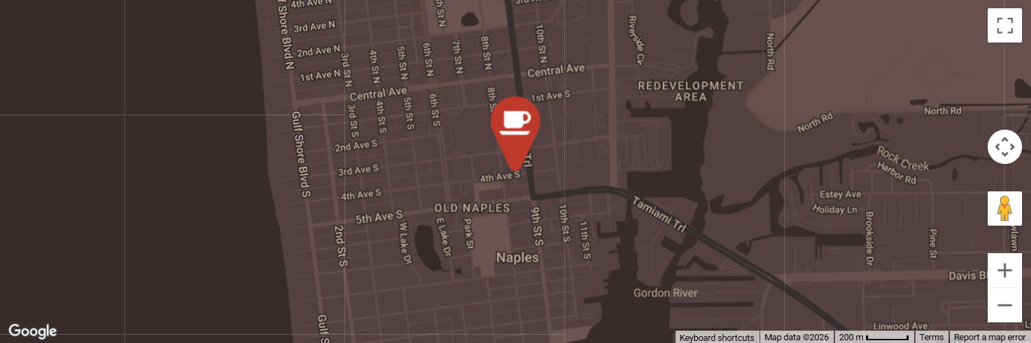 We welcome you to sip a delicious cup of coffee at our coffee shop just steps from the vibrant center of Downtown Naples, FL. Surrounded by the beauty and charm of Naples, a delicious cup of coffee, cappuccino or espresso is the perfect way to start the day.